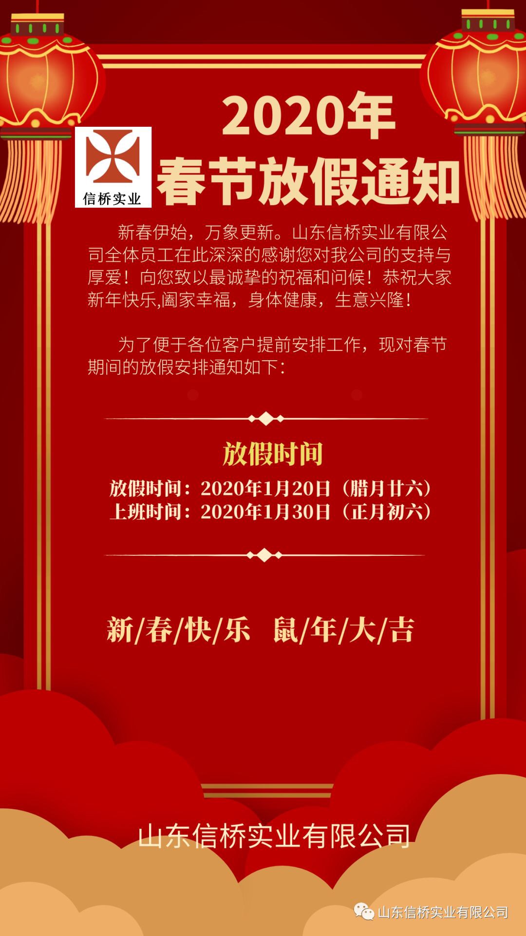Notice of Spring Festival Holiday in 2020